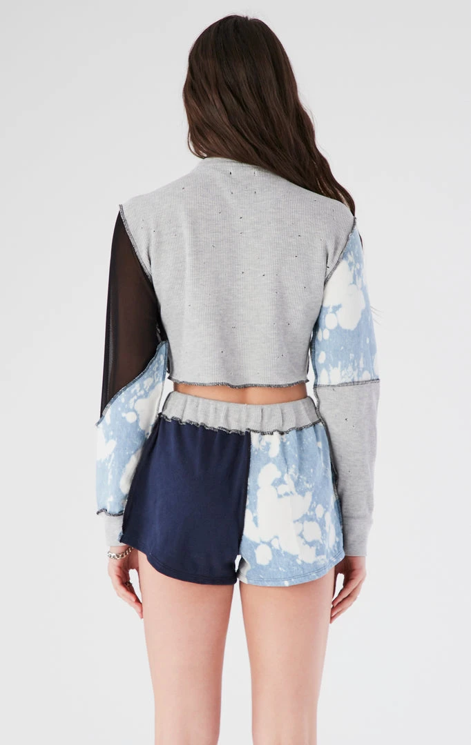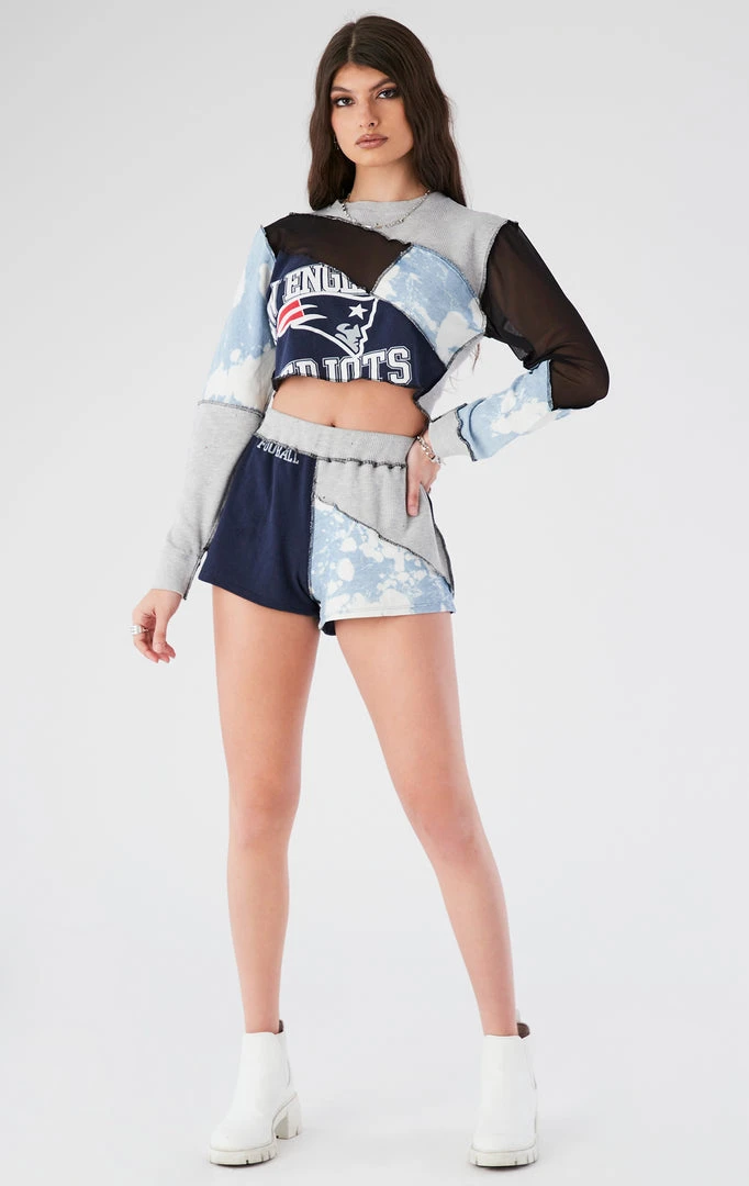 This one-of-a-kind mixed media top and short set was crafted by Furst of a Kind from a New England Patriots tee. Spliced together with vintage thermal, vintage bleached chambray and sheer black mesh panels.