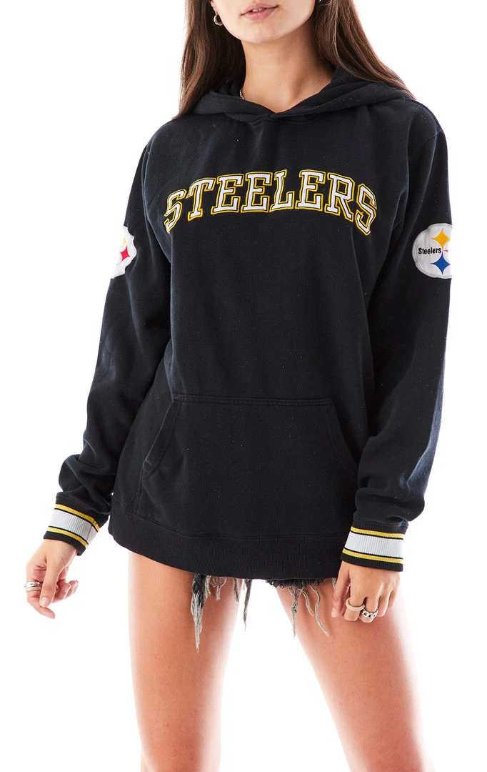 The perfect vintage Pittsburgh Steelers hooded sweatshirt. Period. Let’s be honest, a classic vintage sports hoodie never goes out of style. This one was sourced by the Furst of a Kind team & reworked just a touch with a stonewash process to add to the effortless naturally distressed look and feel. You can really never have enough.Â