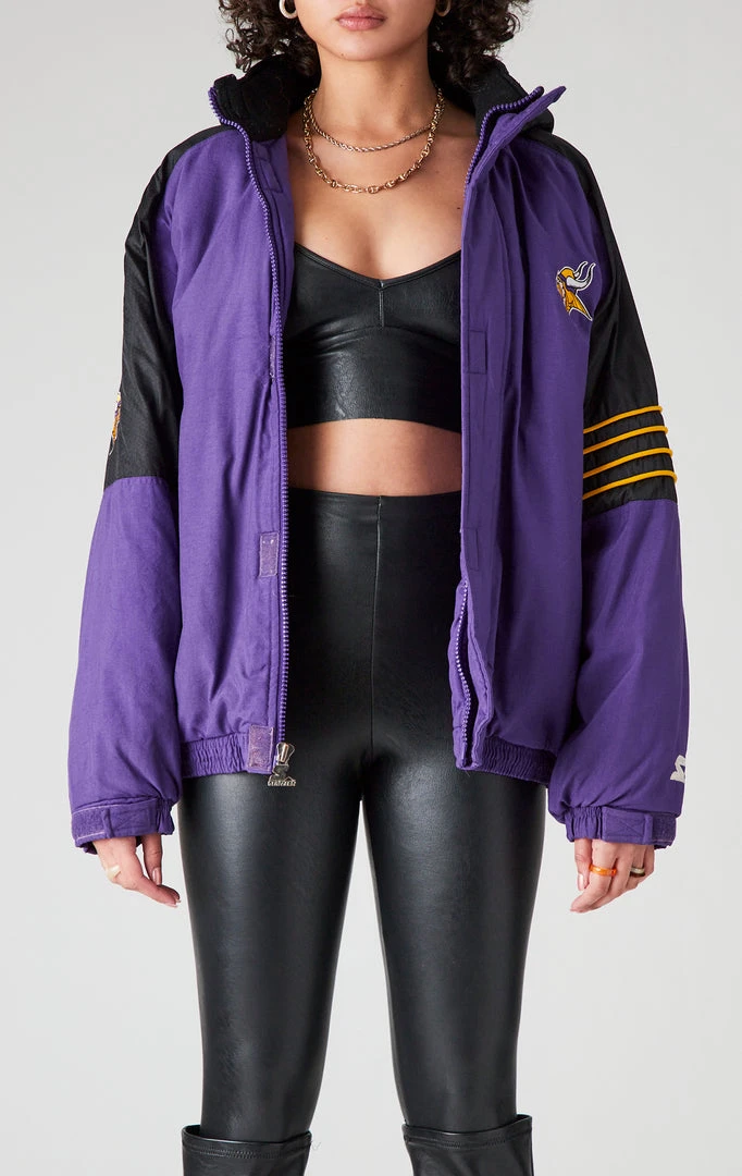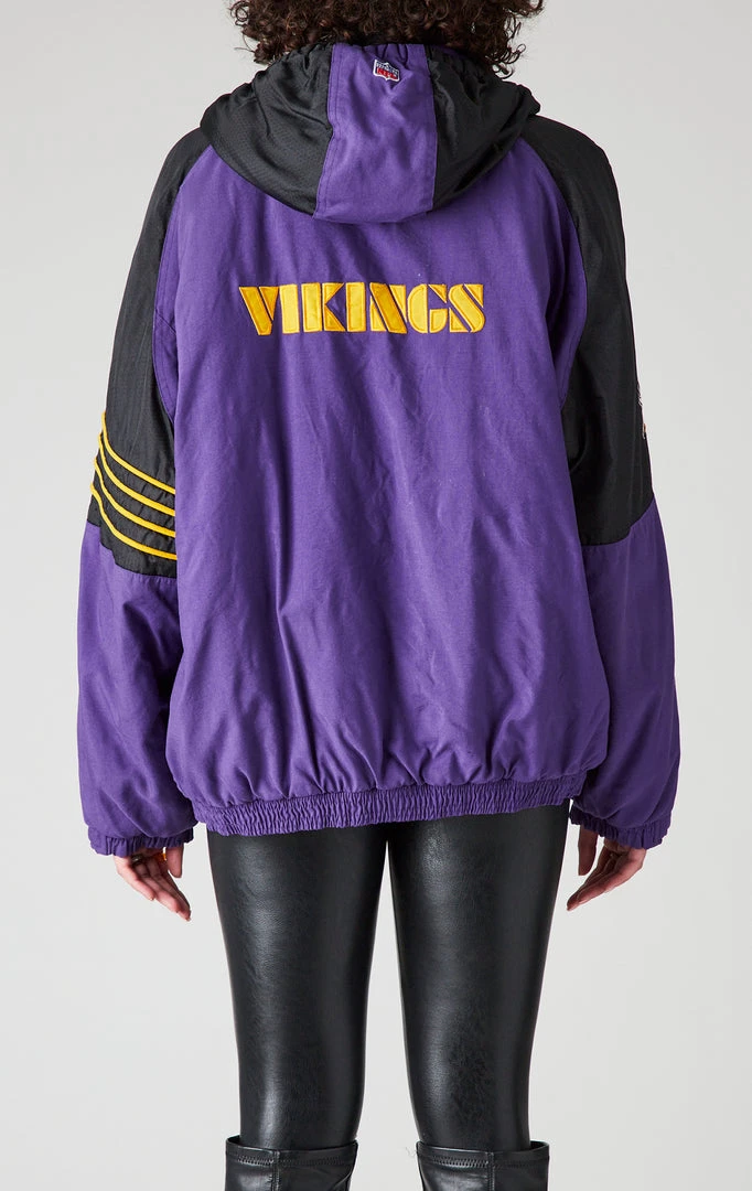 It’s about to be brick outside, don’t let your look suffer. This one of a kind vintage Minnesota Vikings heavy zip up windbreaker jacket is the layering piece you need to keep you looking cool and feeling cozy. Furst of a kind knows where it’s at. You’re always on the hunt for the perfect vintage jacket, right? You see it, you like it, you want it, you got it.Â