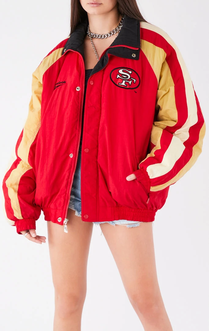 It’s about to be brick outside, don’t let your look suffer. This one of a kind vintage San Francisco 49ers heavy zip up windbreaker jacket is the layering piece you need to keep you looking cool and feeling cozy. Furst of a kind knows where it’s at. You’re always on the hunt for the perfect vintage jacket, right? You see it, you like it, you want it, you got it.