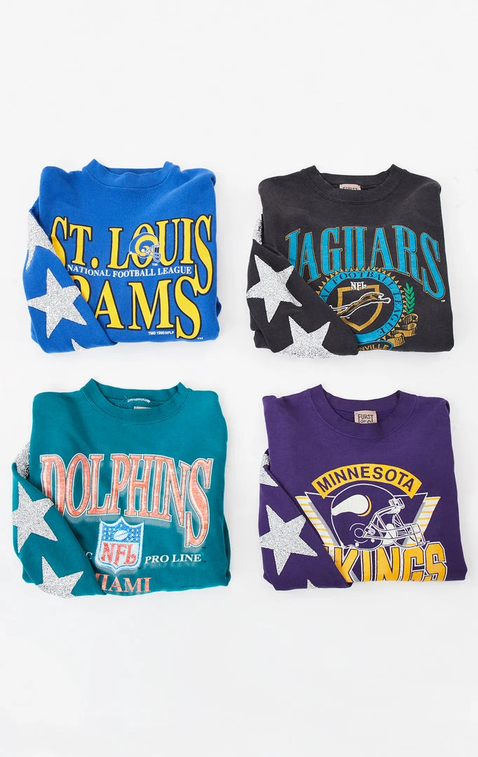 Upcycled from vintage sweatshirts. Furst of a Kind reworked these sweatshirts with silver star patch embellishment down both sleeves.Â