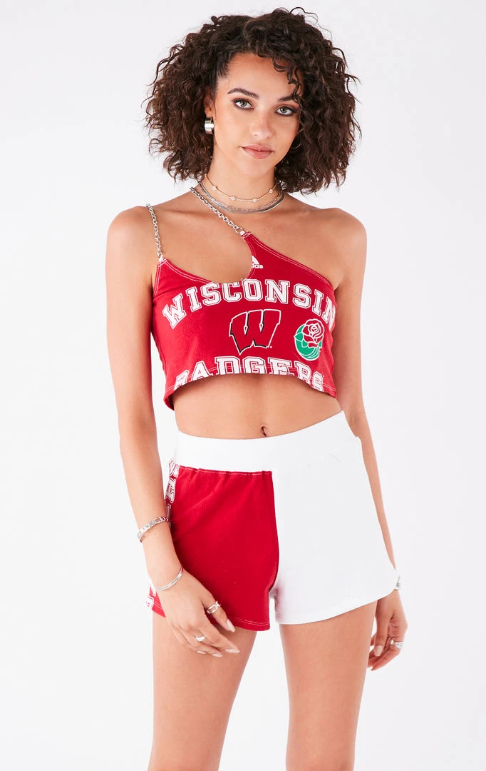 Furst of a Kind took a vintage University of Wisconsin tee and reworked it into a two-piece set. This set is complete with a one-shoulder double chain tank top and spliced shorts.