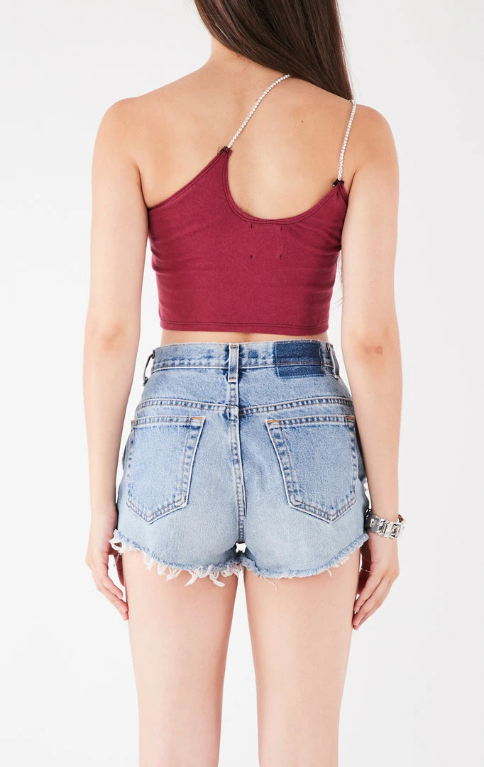 Furst of a Kind took this vintageĀ Boston College tee and reworked it into a priceless gem. This tank is complete with a one-shoulder cut out, cropped hem and double rhinestone chain straps.Ā