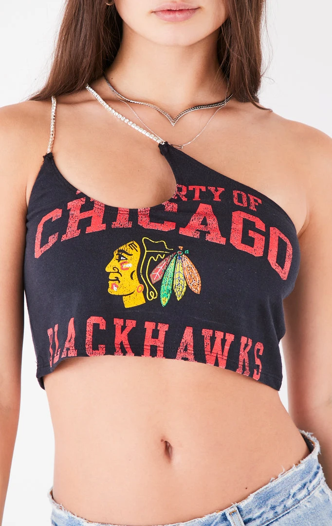 Furst of a Kind took this vintage Chicago Blackhawks tee and reworked it into a priceless gem. This tank is complete with a one-shoulder cut out, cropped hem and double rhinestone chain straps.Â
