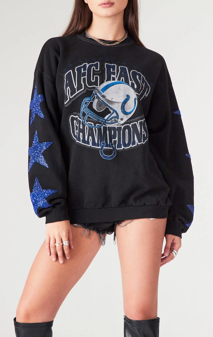 Put your thing down flip it and rework it. Furst of a kind made their mark on this vintageĀ Indianapolis Colts sweatshirt with a fresh black overdye process. How could we be even more obsessed? AddĀ blue rhinestone star patches to the sleeves, that’s how. Done and done.Ā