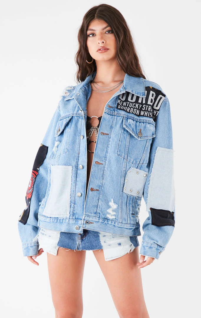 This reworked denim jacket was upcycled by Furst of a Kind. Crafted from the perfect oversized vintage Levi’s denim jacket body and patches from a vintage Jim Beam tee, denim and finished off with studding. Hand sourced and sewn in Los Angeles, this style is sustainable and totally one of a kind.