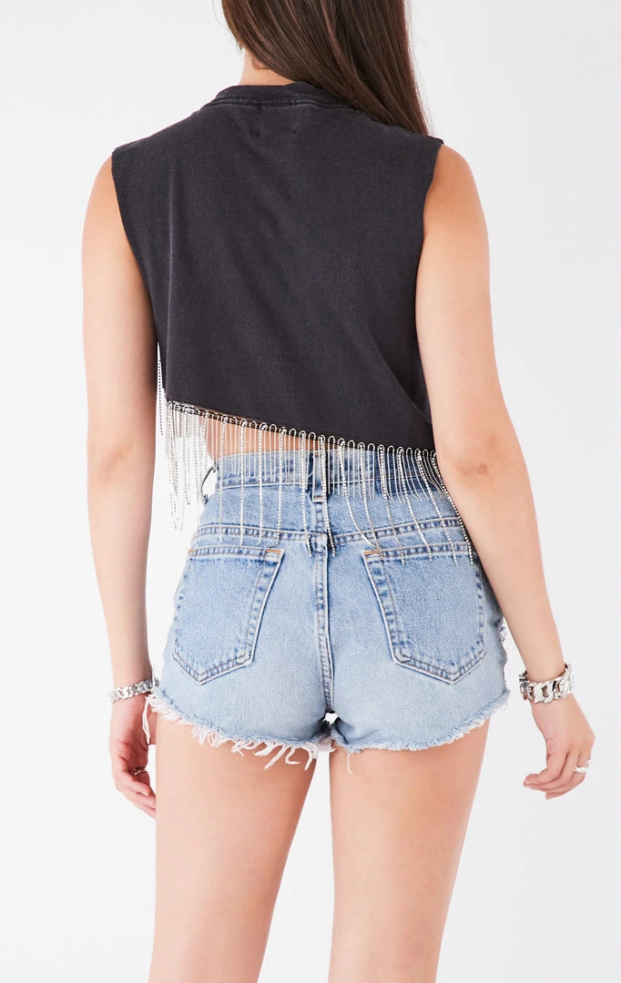 Furst of a Kind sourced this vintage Buffalo Bills tee and gave it an innovative upgrade. Features a stonewash technique, asymmetrical crop hem and rhinestone fringe detailing.Â