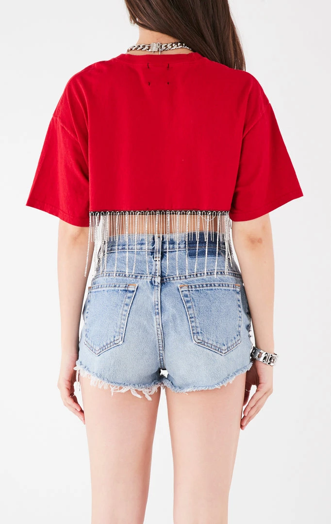 This one-a-kind vintageĀ University of Alabama tee was reworked by Furst of a Kind. Upcycled with a cropped cut andĀ rhinestone fringe at the hem.Ā