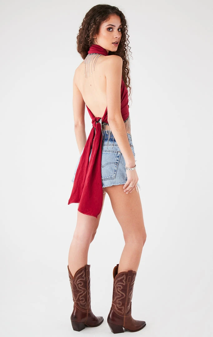 Furst of a Kind created the perfect halter wrap top. This top was reworked from a vintage Florida State University tee and features rhinestone fringe detailing. Cross this vintage wrap around your neck and finish it off with a tie in the back to create the perfect halter top.