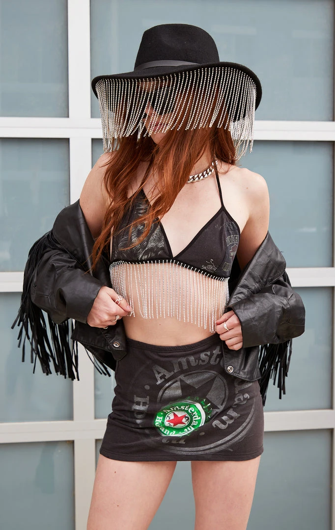 Furst of a Kind created the perfect tie bra top. This top was reworked from a vintageĀ Harley DavidsonĀ tee and features rhinestone fringe detailing.Ā