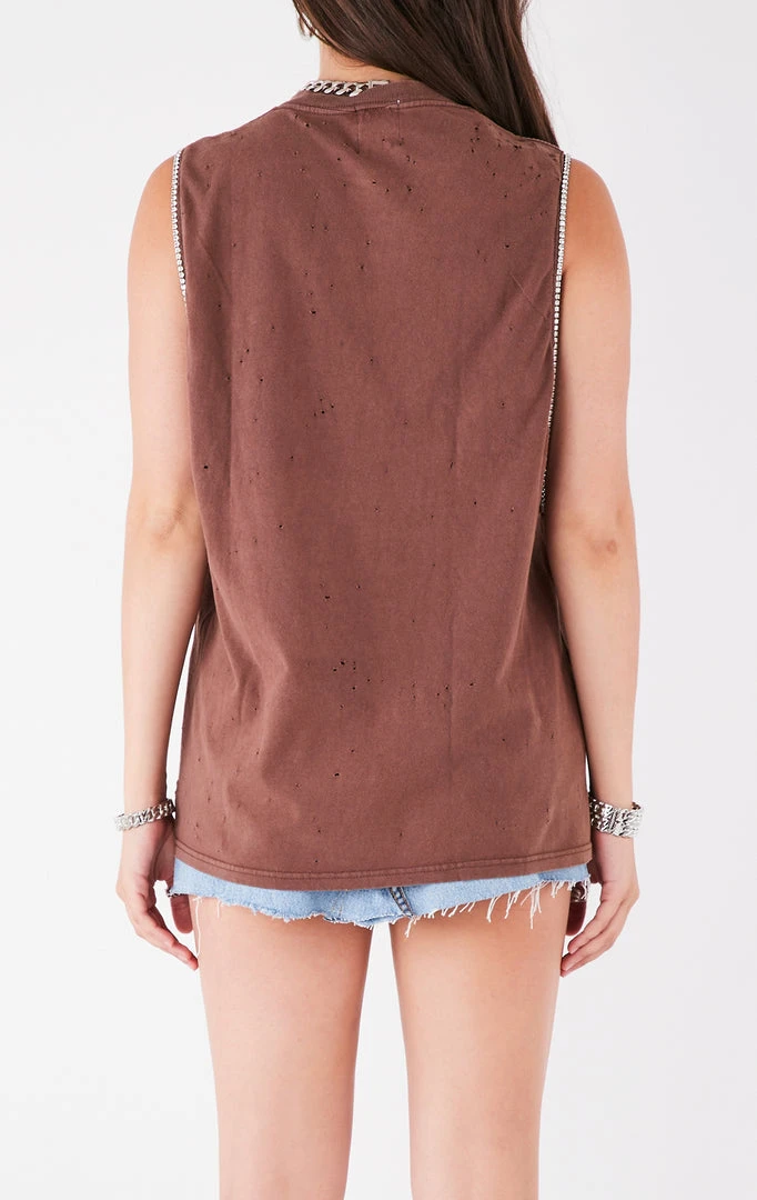 This vintageĀ Cleveland Browns tee was sourced and reworked by Furst of a Kind. FeaturesĀ a dramatic sleeveless cut and rhinestoneĀ trim.Ā