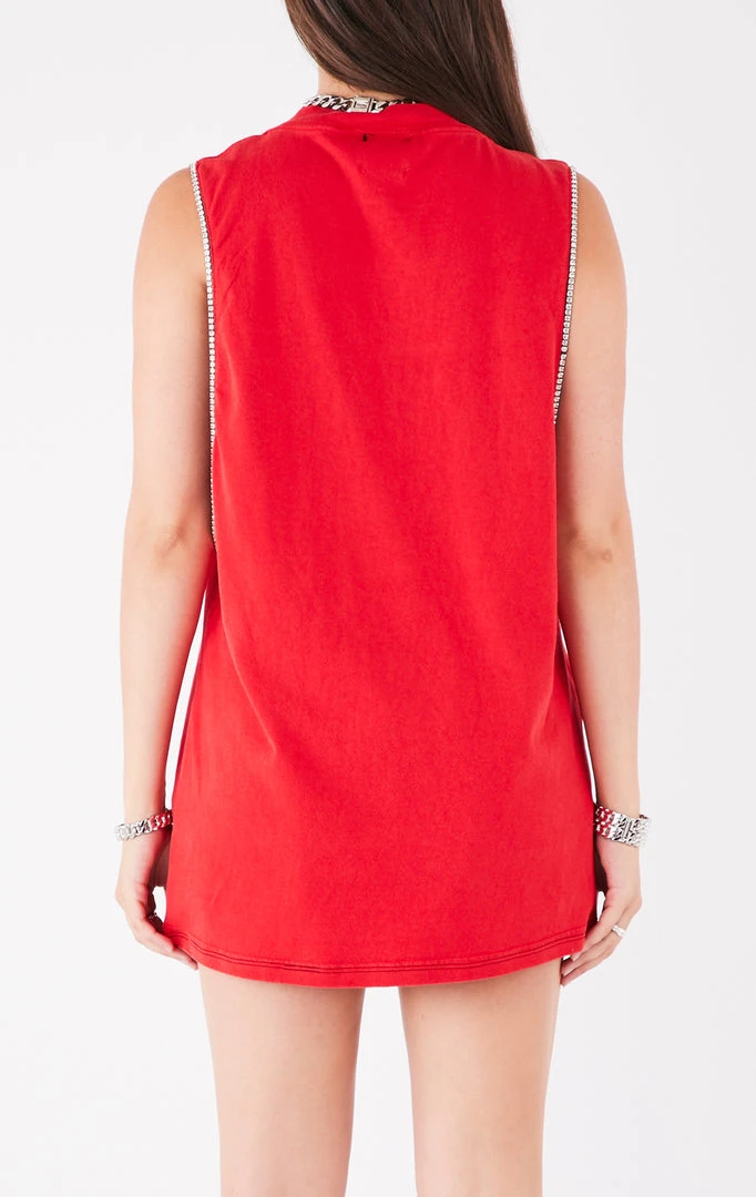 This vintageĀ Kansas City Chiefs tee was sourced and reworked by Furst of a Kind. FeaturesĀ a dramatic sleeveless cut and rhinestoneĀ trim.Ā