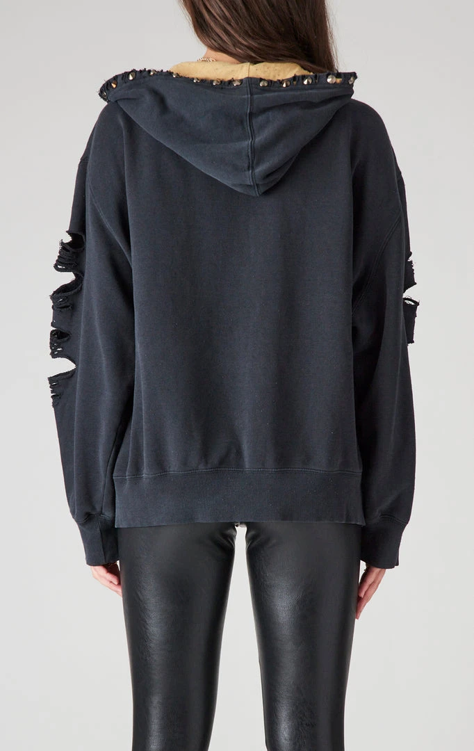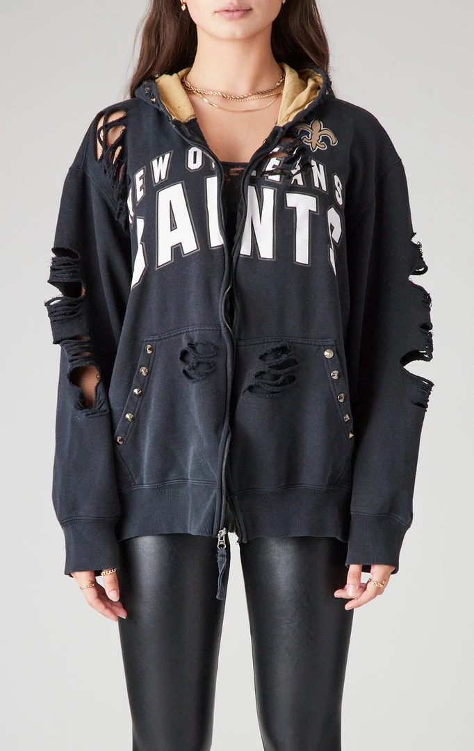 This vintage New Orleans Saints zip up hoodie will add some major edge to your look. This vintage hooded sweatshirt was sourced by Furst of a Kind. It features shredding throughout and hand studded embellishment on the hood and front pockets.
