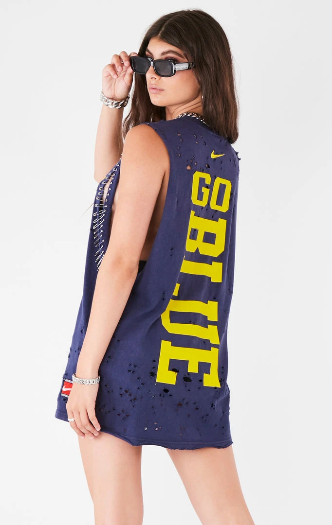 ThisĀ vintage University of Michigan teeĀ was sourced and reworked by Furst of a Kind in Los Angeles withĀ a dramatic sleeveless cut and safety pin detailing.