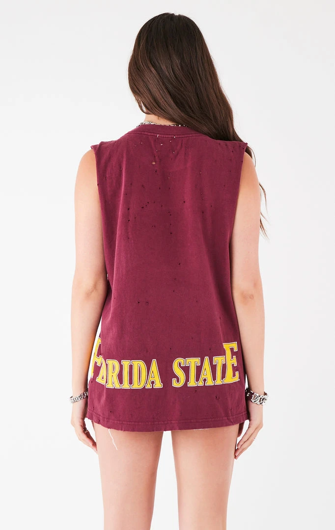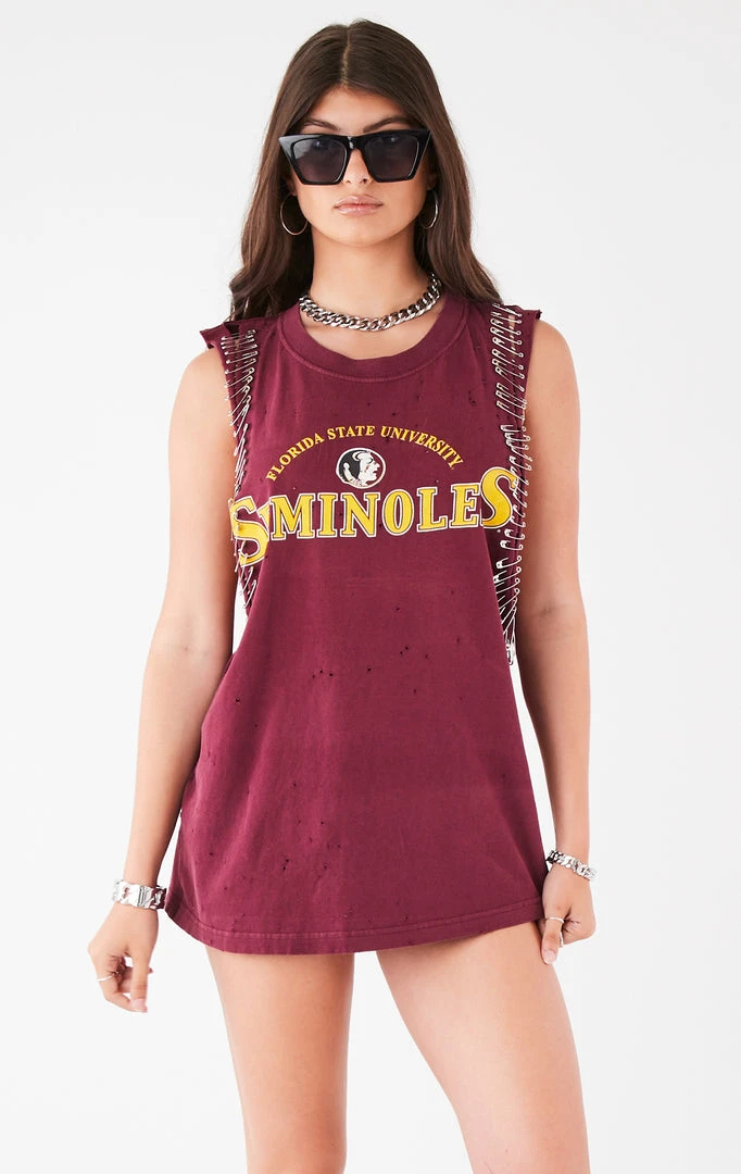 This vintage Florida State University tee was sourced and reworked by Furst of a Kind in Los Angeles with a dramatic sleeveless cut and safety pin detailing.