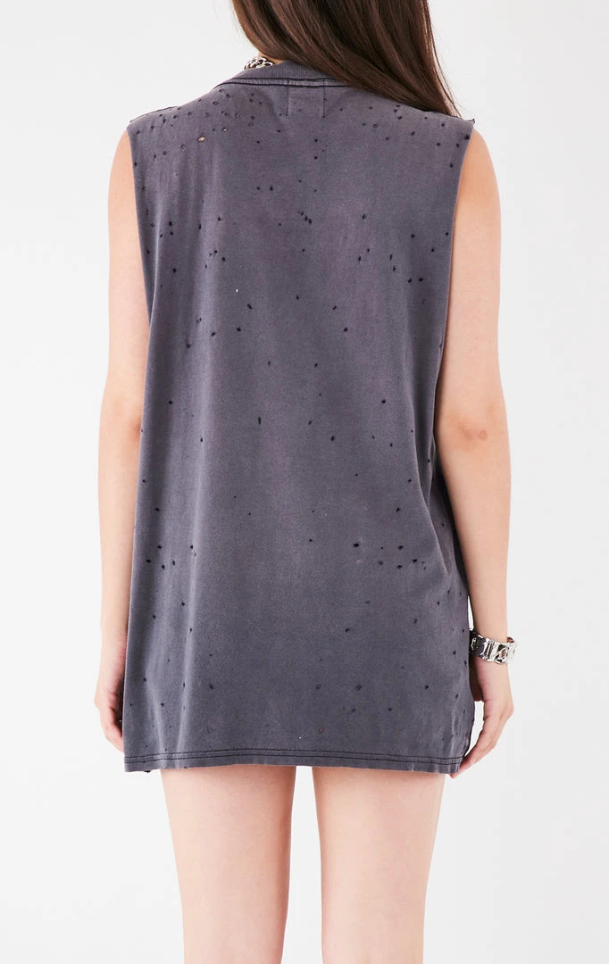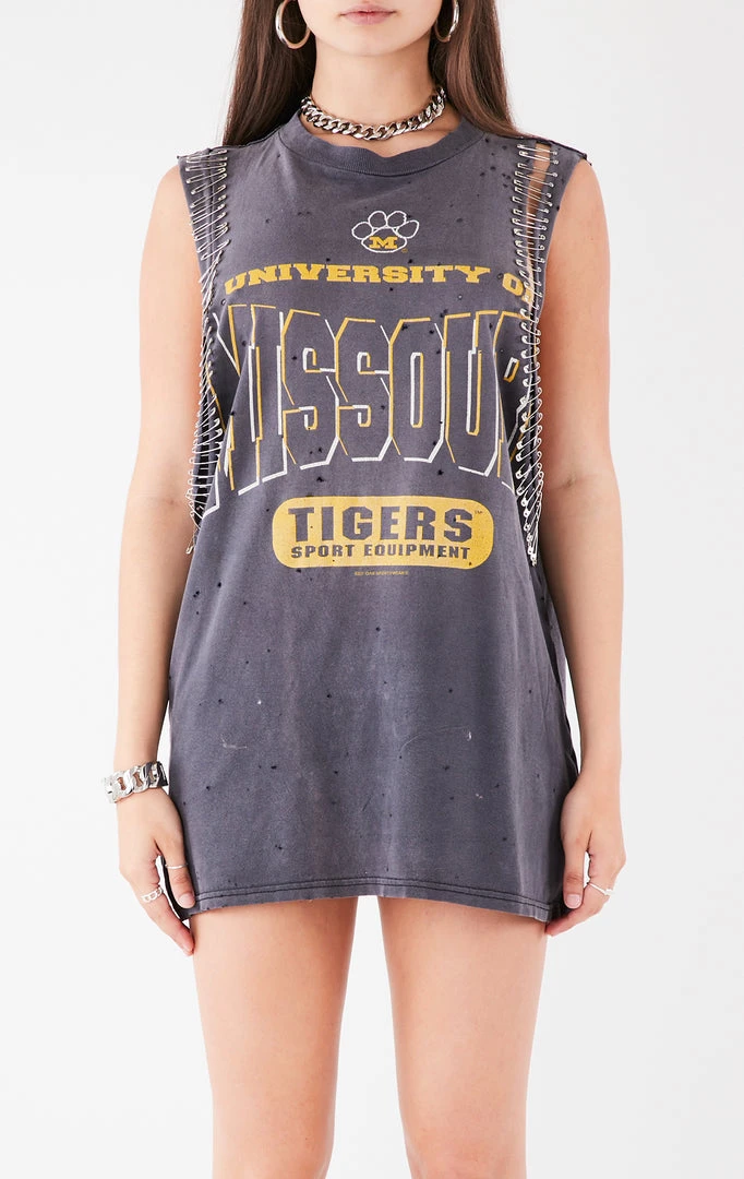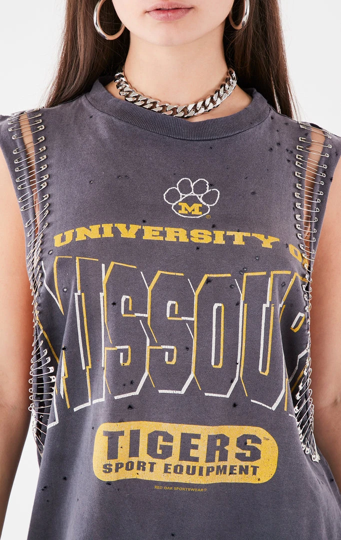This vintage University of Missouri tee was sourced and reworked by Furst of a Kind in Los Angeles with a dramatic sleeveless cut and safety pin detailing.