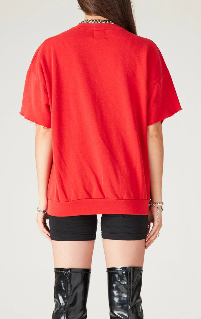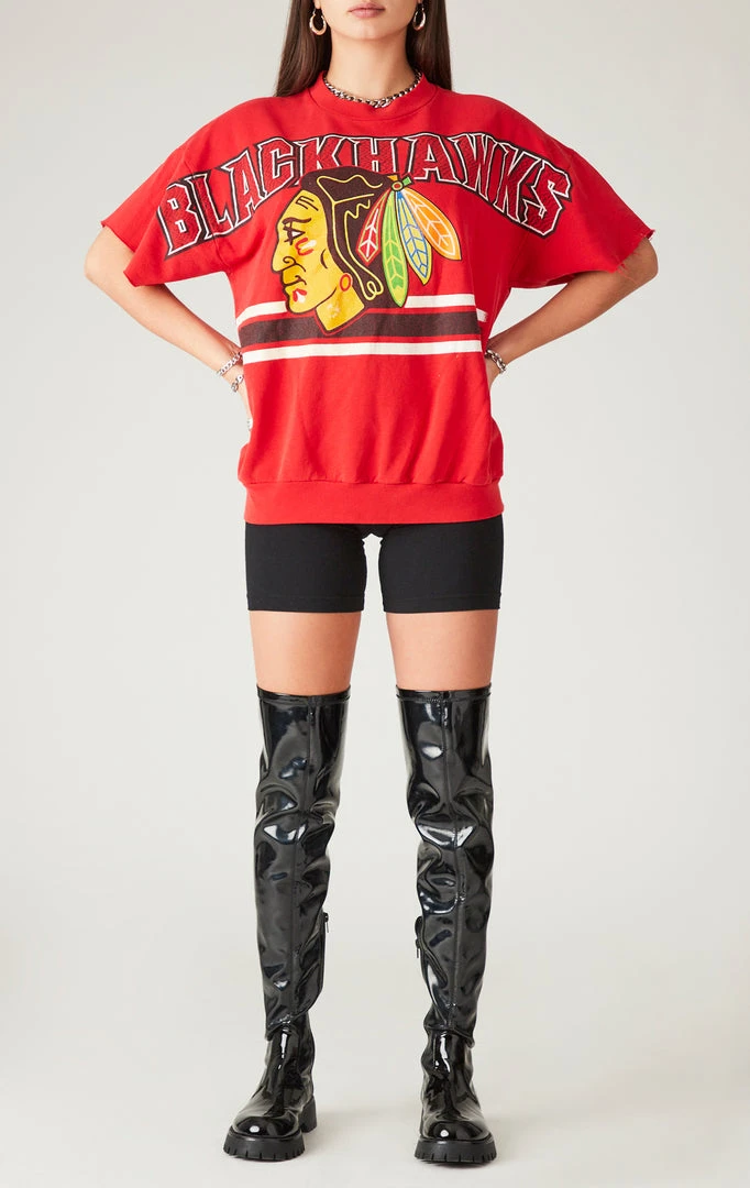 For the days when you wanna be comfy & cute, but also keep it cool. This reworked one of a kind vintage Chicago Blackhawks sweatshirt is the perfect piece. You can never have enough oversized sweatshirts, but the cut-off short sleeves add a fresh new element to your collection. You’ll get that worn in vintage feel and comfort without all the heat.