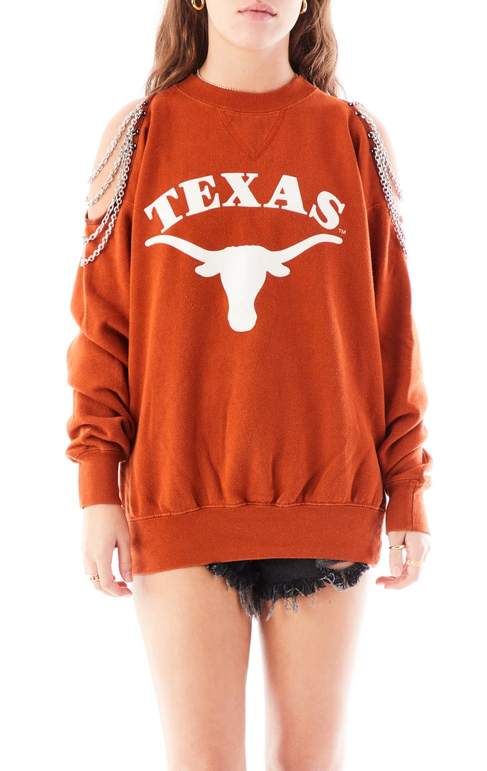 Give the other team the cold shoulder in this reworked vintage University of Texas sweatshirt. Featuring cut out shoulder detailing that is draped and dripping in silver chains. Trust us, this Furst of a Kind piece is a major crowd pleaser. It’s one of a kind sustainability with an attitude, and we’re here for it.