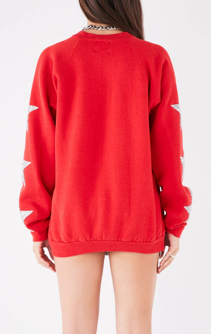 Upcycled from a vintage University of Hawaii sweatshirt. Furst of a Kind reworked this college sweatshirt with silver star patch embellishment down both sleeves.Â