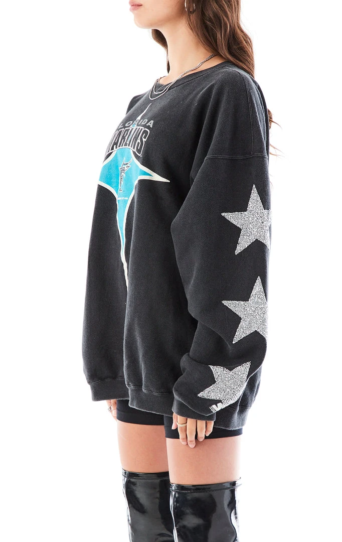 All star status. This Furst of a Kind reworked vintage Florida Marlins sweatshirt is what dreams are made of. Silver rhinestone star patches adorn the sleeves or this handpicked vintage crewneck MLB sweatshirt. Starstruck? don’t be shy, add to cart.