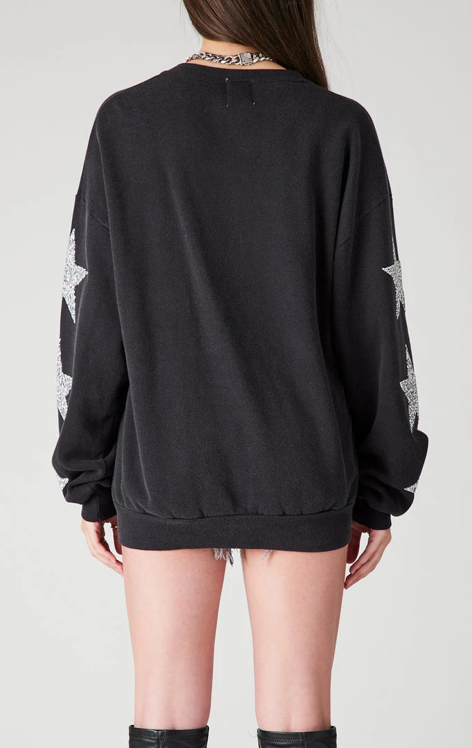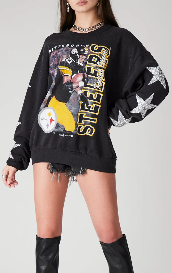 Upcycled from a vintageĀ Pittsburgh SteelersĀ sweatshirt. Furst of a Kind reworked thisĀ college sweatshirt with silver star patch embellishment down both sleeves.Ā