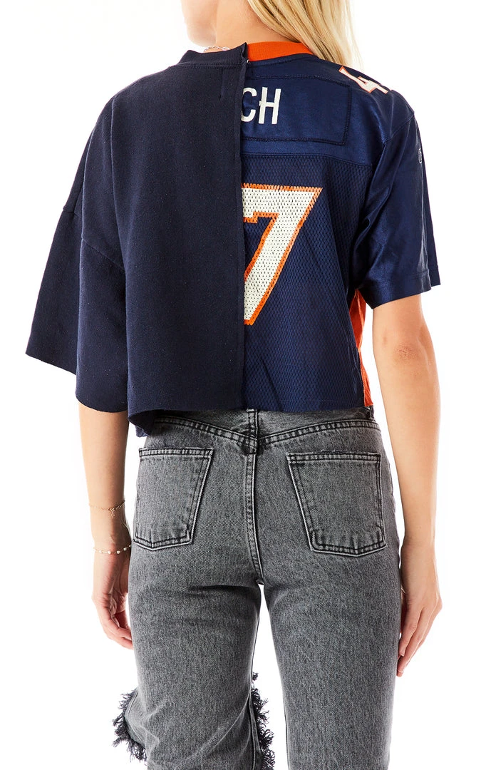 Talk about a perfect pair. Furst of a Kind spliced together a vintage Denver Broncos football jersey & sweatshirt to create this iconic reworked look. The fit is oversized with a cropped cut for styling ease. You know what to do.Â