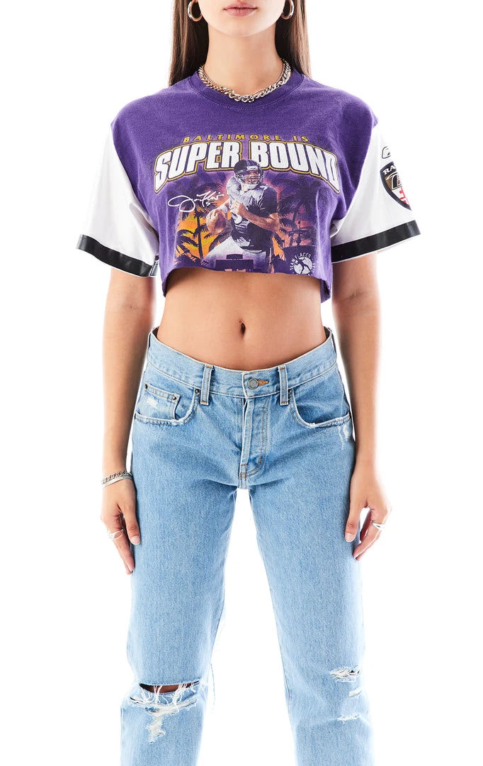 Crop it like it’s hot. This Furst of a Kind Baltimore Ravens vintage tee was updated by hand with an effortlessly cool cropped cut and spliced football jersey sleeves. The easiest crewneck vintage tee to throw on & go. Easy outfit check.Â