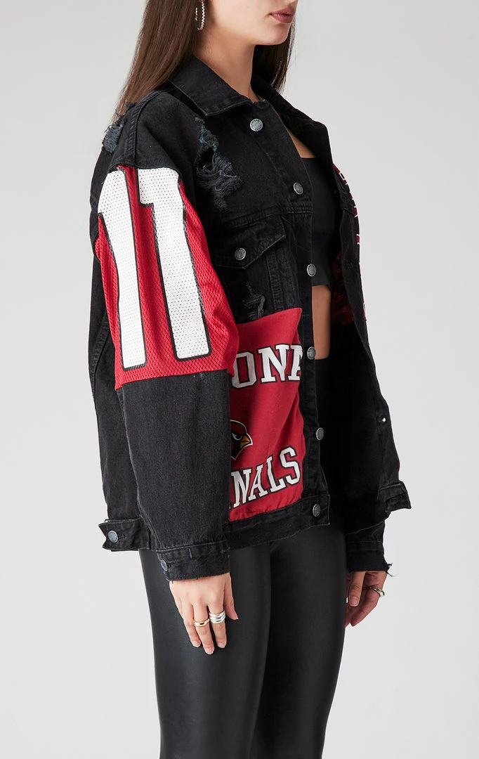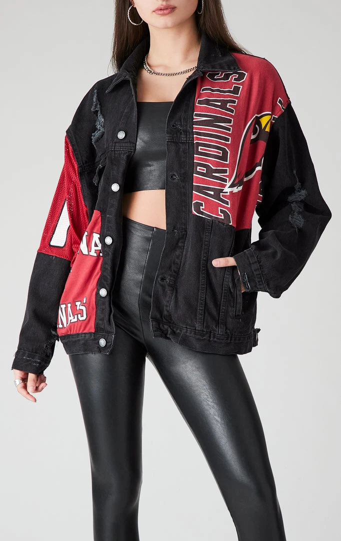 You need this Furst of a Kind reworked denim jacket. Hand sourced, sewn & spliced, thisĀ vintageĀ Arizona CardinalsĀ patchworkĀ denim jacket is the epitome of cool. Featuring assorted vintage graphic inserts throughout.