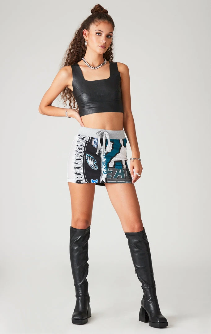 This vintage Philadelphia Eagles skirt was hand sourced, sewn & spliced by Furst of a Kind. Features assorted vintage graphic inserts.
