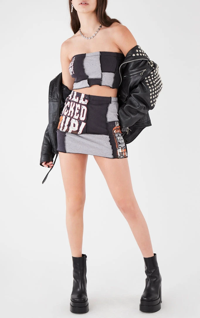 This one-of-a-kind setĀ was crafted from vintageĀ Jack Daniels tee pieces sourced all over the USA. Furst of a Kind reworked them and spliced them together creating a two-piece set with a fit to flatter.Ā Ā