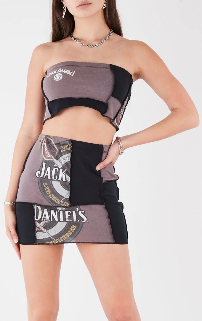 This one-of-a-kind setĀ was crafted from vintageĀ Jack Daniels tee pieces sourced all over the USA. Furst of a Kind reworked them and spliced them together creating a two-piece set with a fit to flatter.Ā Ā