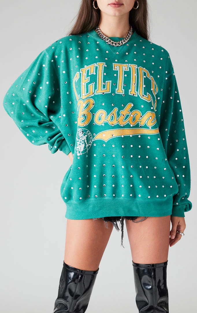 It’s all about the bling, baby. This one of a kind vintageĀ Boston CelticsĀ sweatshirt boasts some serious sparkle. The Furst of a Kind team embellished this piece by hand, featuring Allover Rhinestone embellishment scattered across the bodice and sleeves. Dress it up or dress it down, but this beauty is meant to shine.