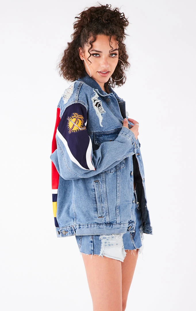It’s all about the back detail on this one of a kind repurposed blue denim jacket. Furst of a Kind added a vintage Florida Panthers graphic on the back and shoulders, and we are officially obsessed.Â