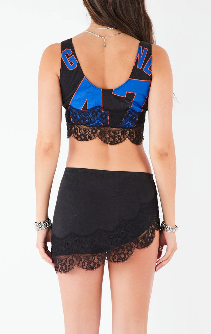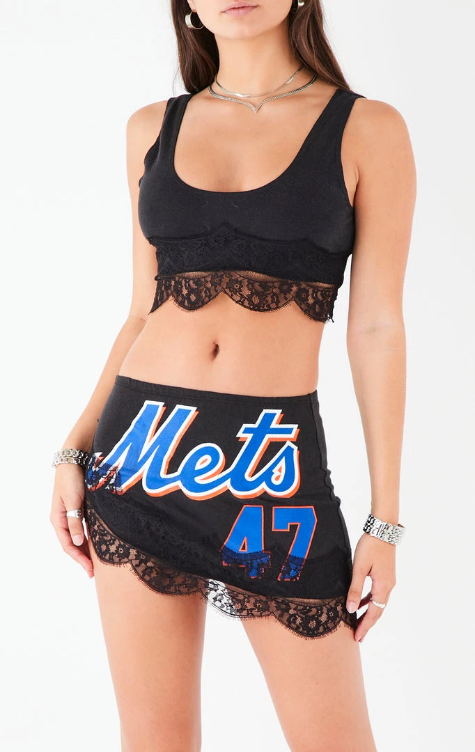 This vintage New York Mets tee was upcycled by Furst of a Kind and reworked into a one-of-a-kind two piece set. This tank top and skirt set features lace trim.