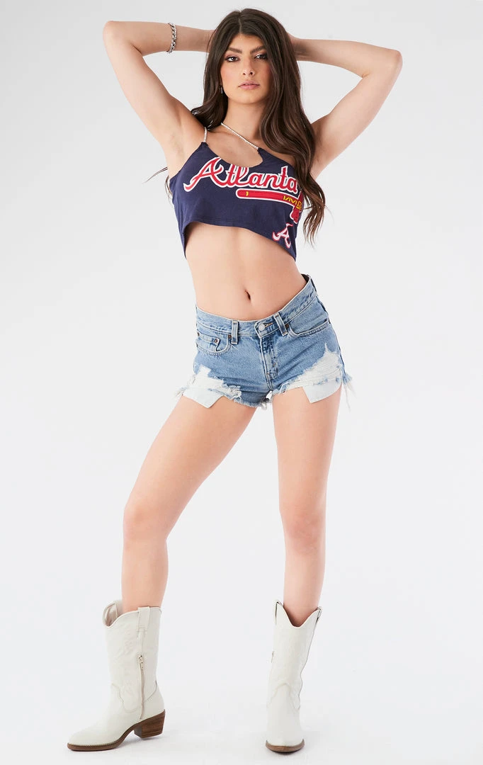 Furst of a Kind took this vintage Atlanta Braves tee and reworked it into a priceless gem. This tank is complete with a one-shoulder cut out, cropped hem and double rhinestone chain straps.Â