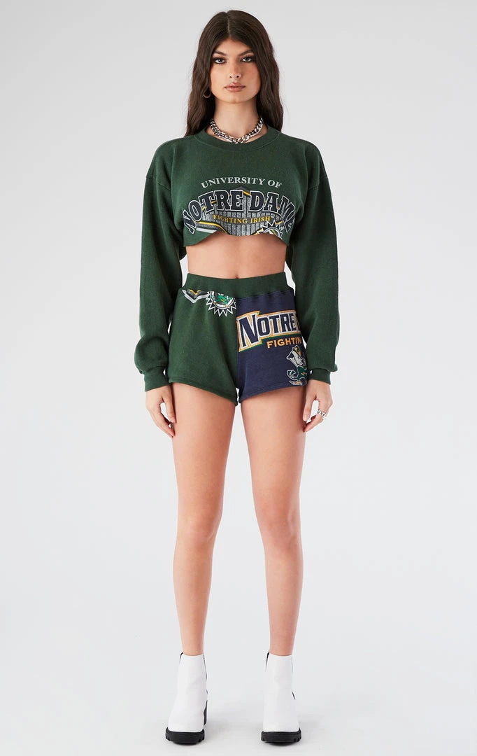 This one-of-a-kind set was reworked by Furst of a Kind from a vintage University of Notre Dame sweatshirt. Redesigned into a two piece set featuring a cropped sweatshirt paired with a spliced sweatshirt short.Â
