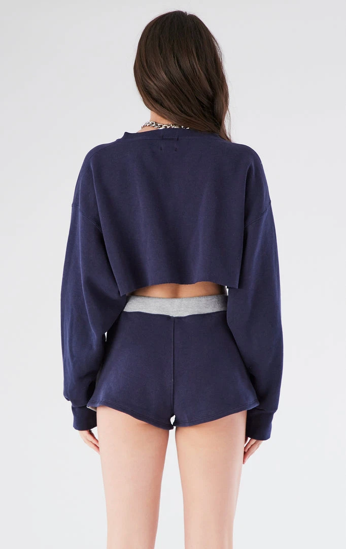 This one-of-a-kind set was reworked by Furst of a Kind from a vintage University of Michigan sweatshirt. Redesigned into a two piece set featuring a cropped sweatshirt paired with a spliced sweatshirt short.