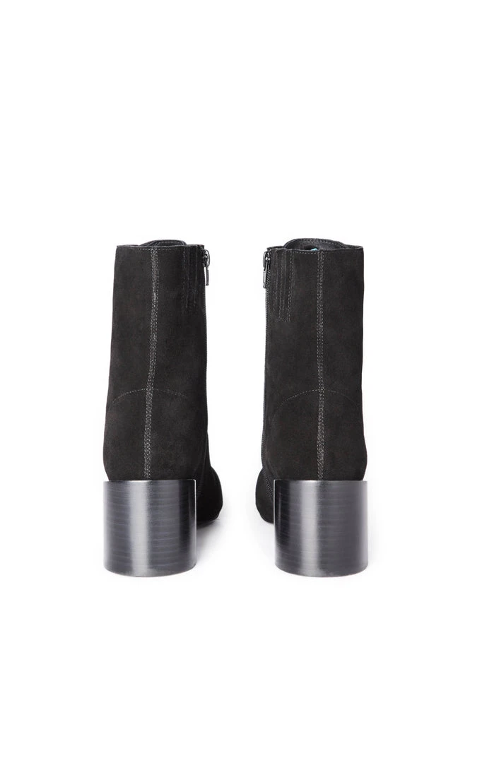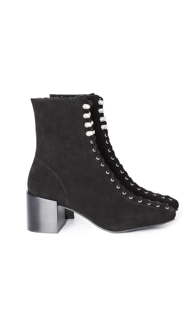 Jeffrey Campbell Belmondo Boot. Features black suede upper, grommets and silver speed hook Lace up detailing. The block heel is just enough height to be on your feet all day but command the compliments.