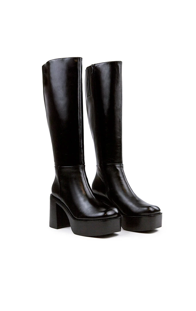 The Band Knee High Square Toe Platform Boot by Jeffrey Campbell. This boot features a 4″ heel with a 1.75″ platform and zipper closure. Leather Upper, Synthetic / Leather Lining, Synthetic Sole.Â