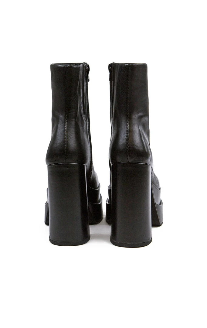 Cobra Platform Boot in Black Leather by Steve Madden. Features a double platform and a 5″ heel. If you are between sizes, size down a half size.